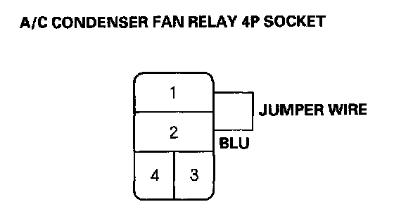 4. Connect the A/C condenser fan relay 4P socket terminals No. 1 and No. 2 with a jumper wire.
