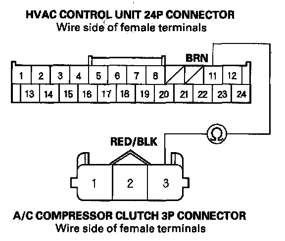 10. Check for continuity between the HVAC control unit 24P connector terminal No. 11 and the A/C compressor clutch 3P connector terminal No. 3.