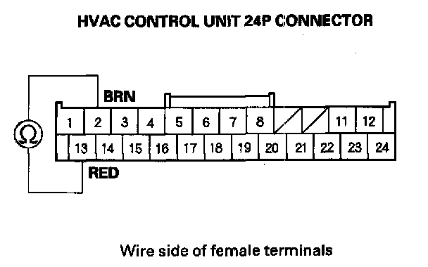 12. Measure the evaporator temperature sensor resistance between the HVAC control unit 24P connector terminals No. 2 and No. 13.