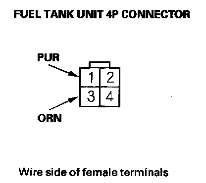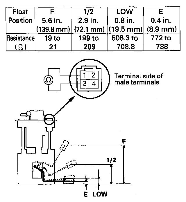 11. Measure resistance between fuel tank unit 4P connector terminals No. 1 and No. 3 with the float at E (EMPTY), LOW (LOW FUEL INDICATOR), 1/2 (HALF FULL), and F (FULL) positions. If you do not get the following readings, replace the fuel gauge sending unit.