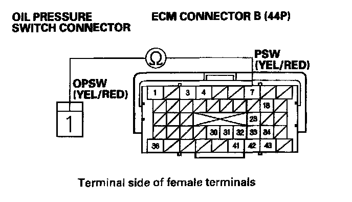 9. Check for continuity between ECM connector terminal B7 and the oil pressure switch connector.