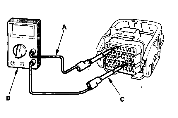5. Connect one side of the patch cord (A) terminals to a commercially available digital multimeter (B), and connect the other side of the paten cord terminals to a commercially available banana jack (Pomona Electronics Tool No. 3563 or equivalent) (C).