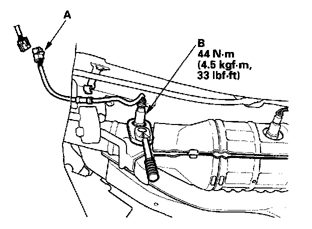 1. Disconnect the A/F sensor 4P connector (A), then remove the A/F sensor (B).