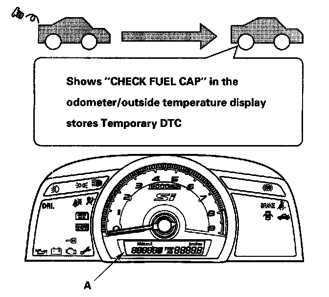 During the first drive cycle after a cold start, the ECM alerts the driver to check the fuel fill cap by showing a "CHECK FUEL CAP" message in the odometer/outside temperature display (A), and it stores Temporary DTC P0457 "Evaporative Emission (EVAP) System Leak Detected/Fuel Fill Cap Loose or Missing". Tightening the fuel cap does not make the message go off immediately.