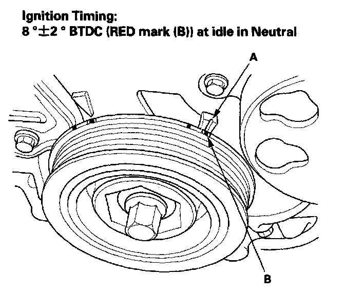 8. Aim the light toward the pointer (A) on the cam chain case. Check the ignition timing under a no load condition (headlights, blower fan, rear window defogger, and air conditioner are turned off).