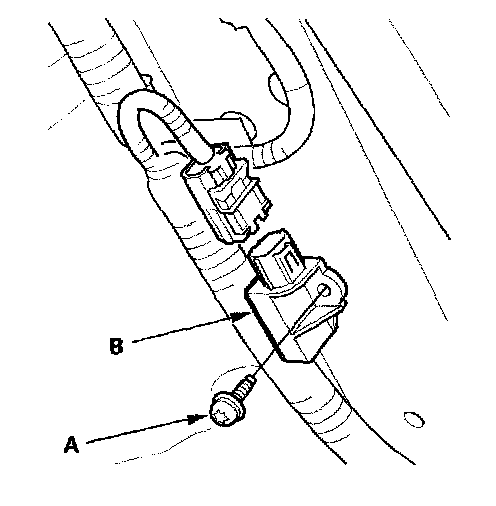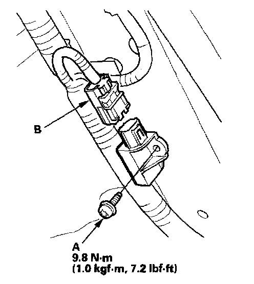 1. Install the new side impact sensor second) with the Torx bolt (A) then connect floor wire harness 2P connector (B) to the side impact sensor second).
