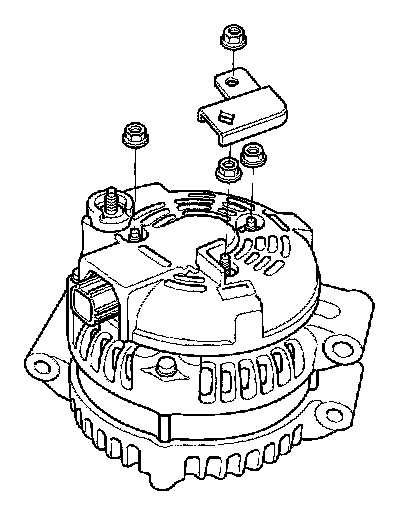 4. Remove the harness stay and the three flange nuts from the alternator.