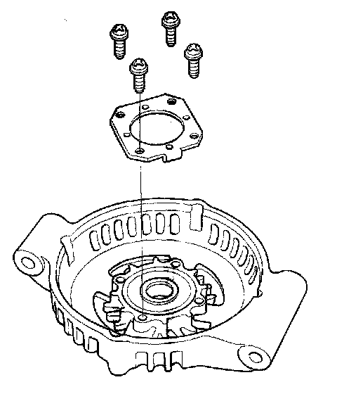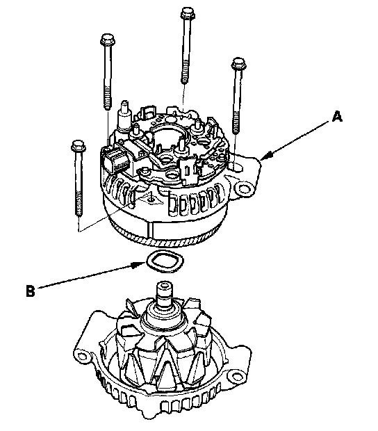 7. Remove the four bolts, then remove the rear housing assembly (A), and washer (B).