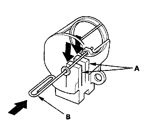 19. Push the brushes (A) in, then insert a pin or drill bit (B) (about 1.6 mm (0.06 in.) diameter) to hold them there.