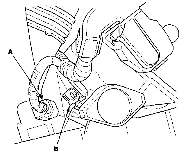 8. Make sure the transmission is in Neutral, and set the parking brake. Disconnect the starter subharness 1P connector (A) from the main wire harness 1P connector (B). Connect a jumper wire from the battery positive terminal to the starter subharness 1P connector.