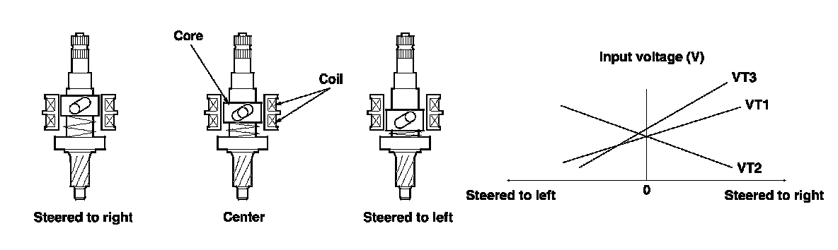 When the steering wheel is turned, twist occurs in the torsion bar between the steering side of the input shaft and the output shaft on the road reaction force side. Inductance is changed by the movement of the core. The amount this voltage changes (varies with the amount of movement, and direction of the core) is amplified with the interface circuitry of the sensor coil, and EPS control unit as a steer signal.