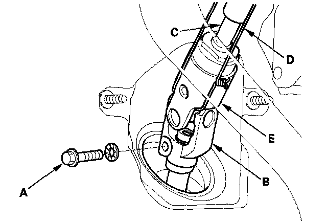 8. Remove the steering joint bolt (A), and disconnect the steering joint by moving the steering joint (B) toward the column. Hold the lower slide shaft (C) on the column with a piece of wire (D) between the joint yoke (E) on the lower slide shaft to the joint yoke on the upper shaft.