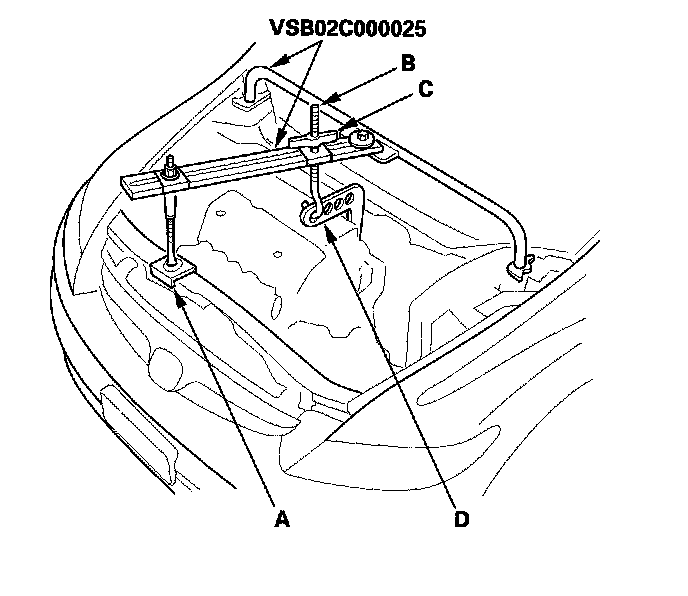 11. Install the front leg assembly (A), hook (B), and wing nut (C) from an A and Reds engine support hanger (AAR-T-12566) onto the engine hanger. Carefully position the engine hanger on the vehicle, and attach the hook to the forward hole in the engine hanger/adapter (D). Tighten the wing nut by hand to lift and support the engine/transmission assembly.