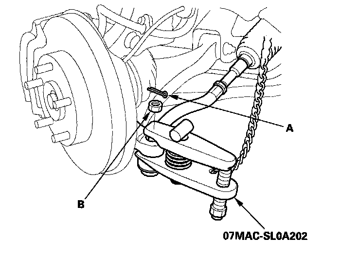 19. Connect the lower arm (A) to the lower ball joint (B).