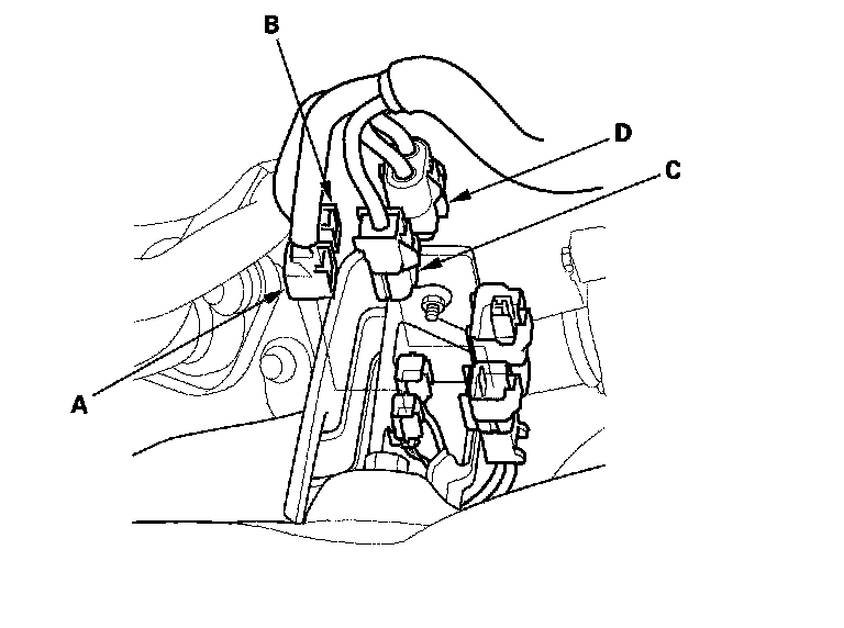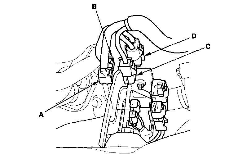 15. Disconnect the torque sensor 4P connector (A), motor-angle sensor 6P connector (B), motor 1P connector (C), and motor 2P connector (D) from the right side of the steering gearbox. Wrap the connectors with vinyl tape to avoid the contamination from grease or water.