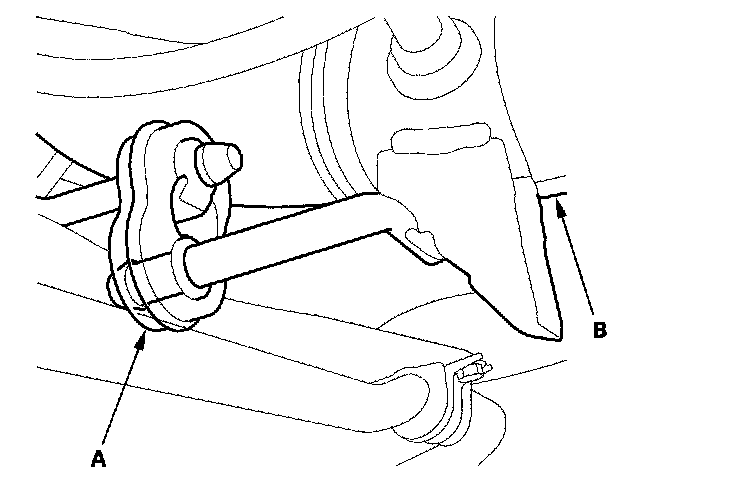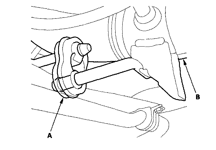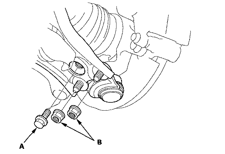 16. Remove the lower ball joint mounting bolt (A) and the flange nuts (B) from the lower arm.