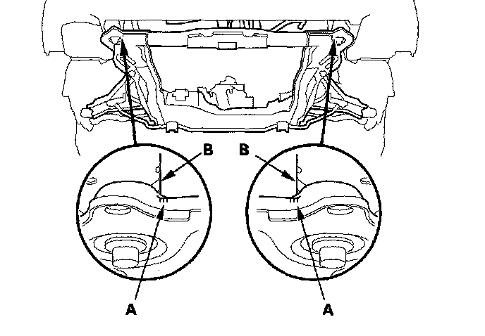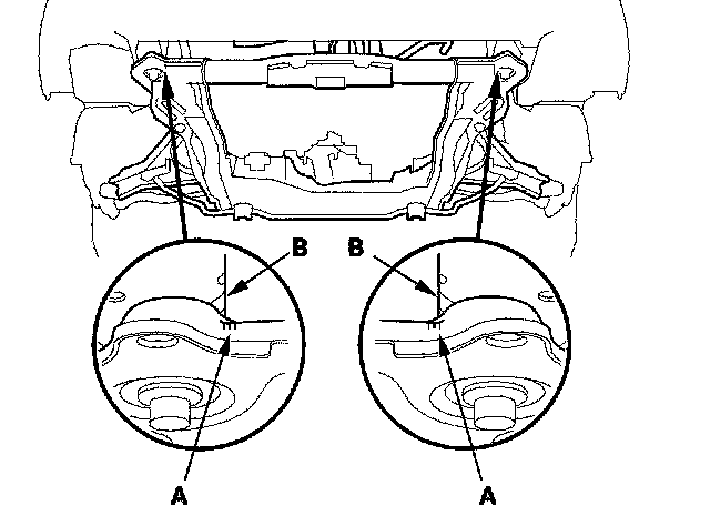 10. Align the front subframe reference marks (A) to the body (B), as noted during removal.