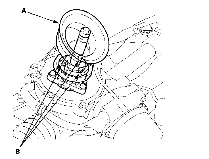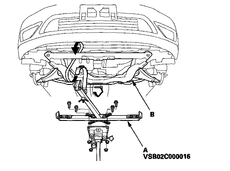 20. Attach the front subframe adaptor (A) to the front subframe (B) and the transmission jack (model number LSL-W9371) or the powertrain lift (model number OTC-1585), then tighten the front subframe adaptor screw.