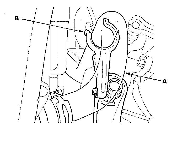 25. Remove the lower radiator hose (A) from the radiator hose stay (B).