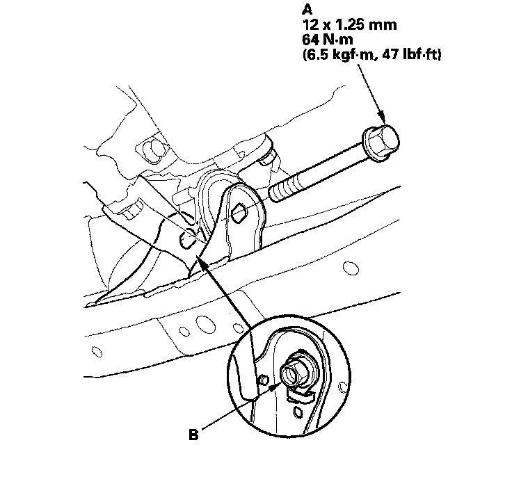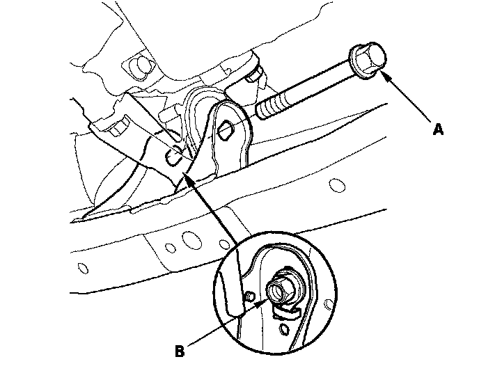 13. Install the new lower engine mounting bolt (A) while holding the nut (B) with a wrench.