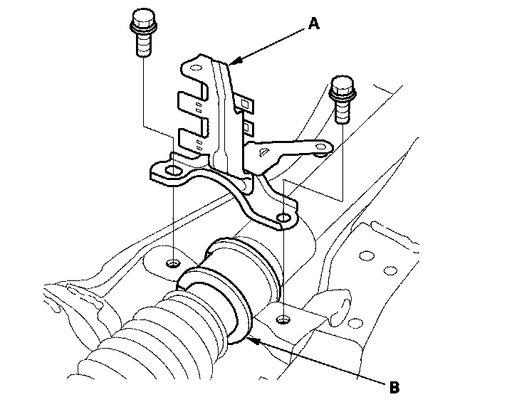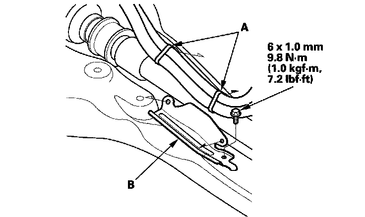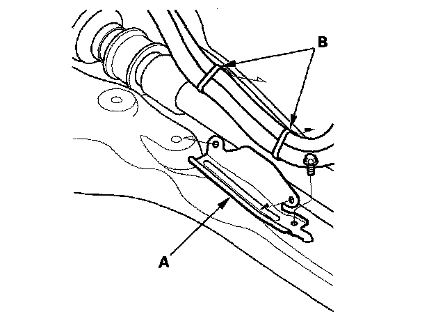8. Install the harness clips (A) to the harness clamp bracket (B), then install the harness clamp bracket to the front subframe.