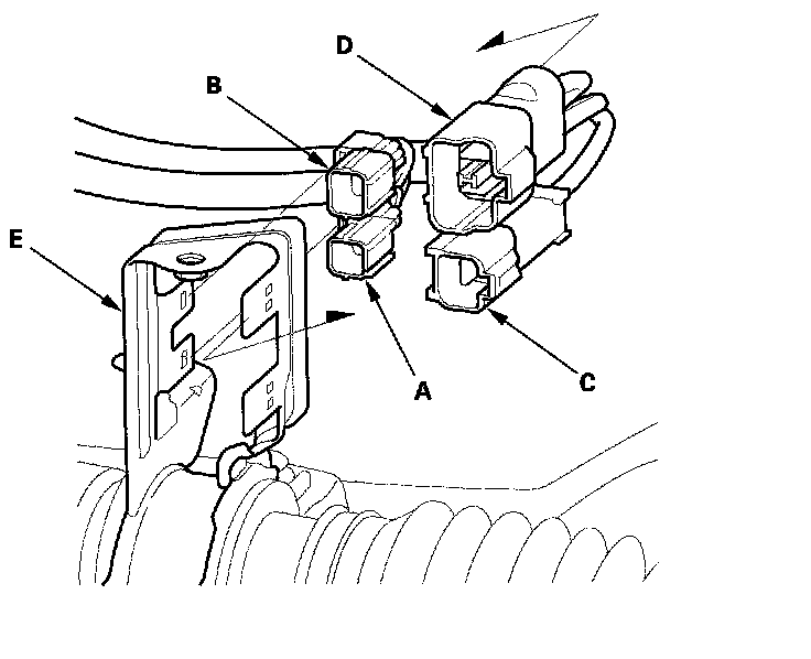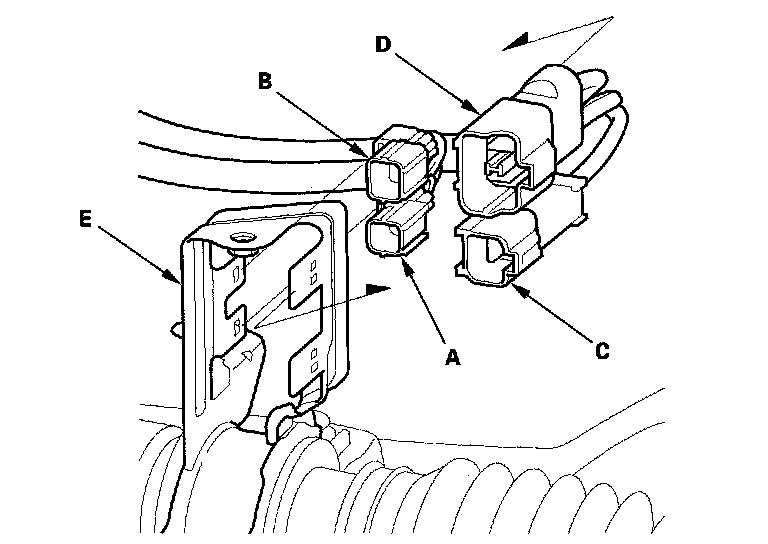 31. Remove the torque sensor 4P connector (A), motor-angle sensor 6P connector (B), motor 1P connector (C) and motor 2P connector (D) from the right side of the gearbox mounting bracket (E).