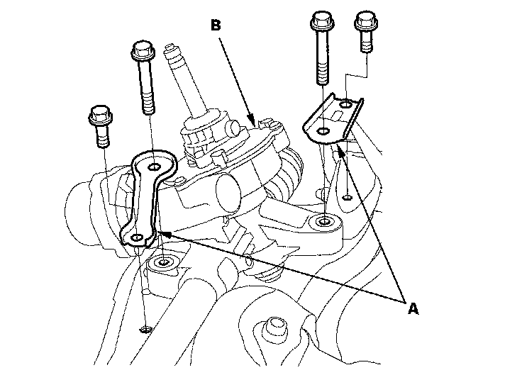 33. Remove the two 10 mm bolts from the right side of the steering gearbox, then remove the gearbox mounting bracket (A) and the mounting cushion (B).