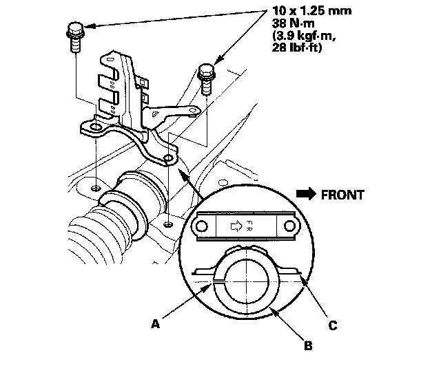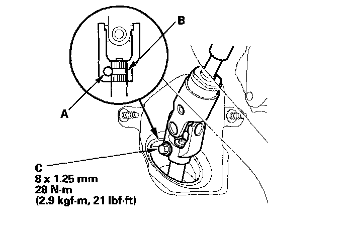 27. Align the bolt hole (A) on the steering joint with the groove (B) around the pinion shaft, and loosely install the joint bolt (C). Be sure that the joint bolt is securely in the groove in the pinion shaft. Pull on the steering joint to make sure that the steering joint is fully seated. Tighten the steering joint bolt to the specified torque.