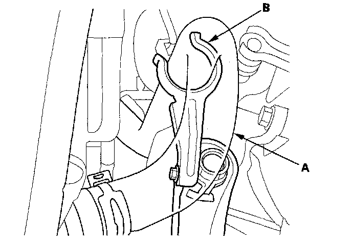 14. Install the lower radiator hose (A) to the radiator hose stay (B).