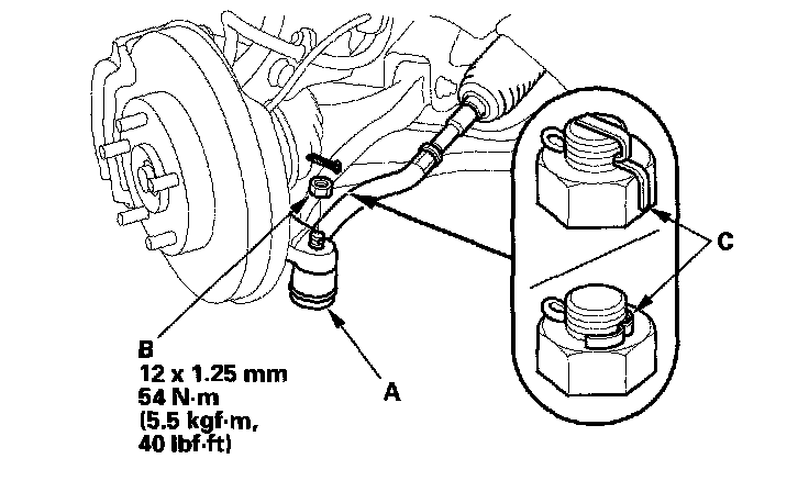 23. Wipe off any grease contamination from the ball joint tapered section and the threads. Reconnect the tie-rod ends (A) to the steering knuckles. Install the 12 mm nut (B), and tighten it.