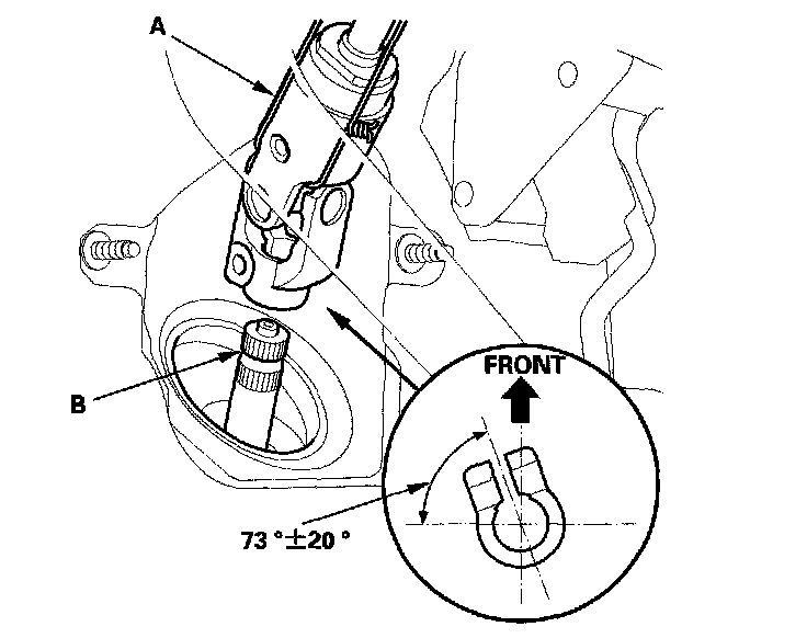 26. With the rack in the straight ahead driving position, cut the wire (A) and slip the lower end of the steering joint onto the pinion shaft (B) in the range shown.