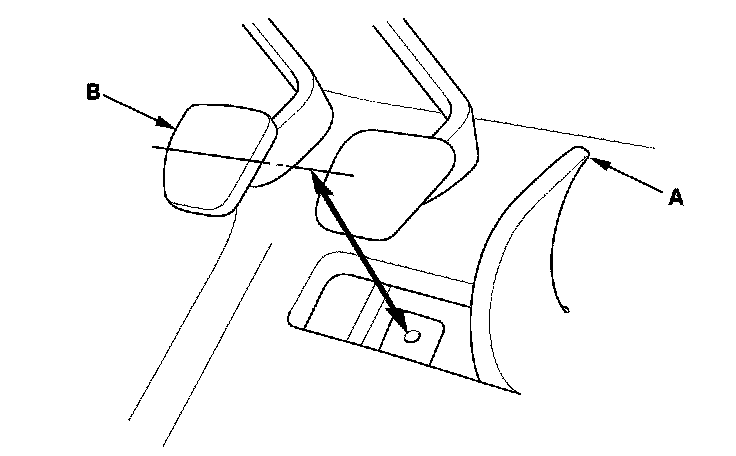 1. Lift up the carpet (A). At the insulator cutout, measure the pedal height from the right side of the pedal pad (B).