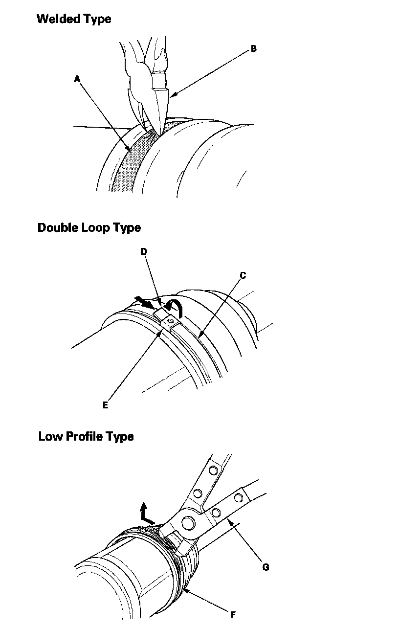 ^ If the boot band is a low profile type (F), pinch the boot band using commercially available boot band pliers (G).