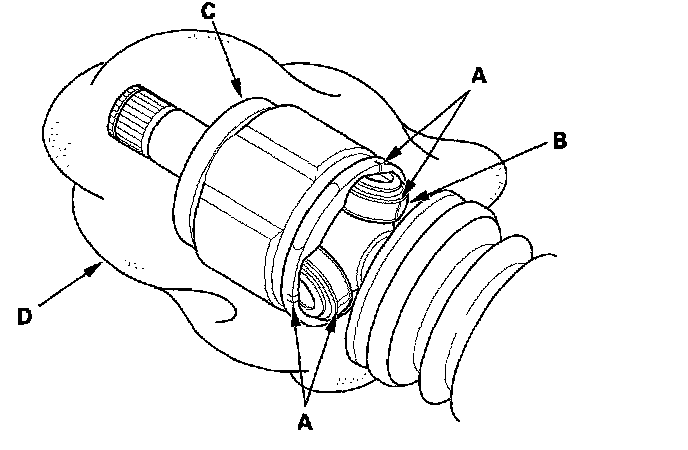 3. Make a mark (A) on each roller (B) and inboard joint (C) to identify the locations of rollers and grooves in the inboard joint. Then remove the inboard joint on the shop towel (D). Be careful not to drop the rollers when separating them from the inboard joint.