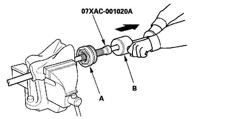 6. Remove the outboard joint (A) using the special tool and a commercially available 5/8"-18 UNF slide hammer (B).