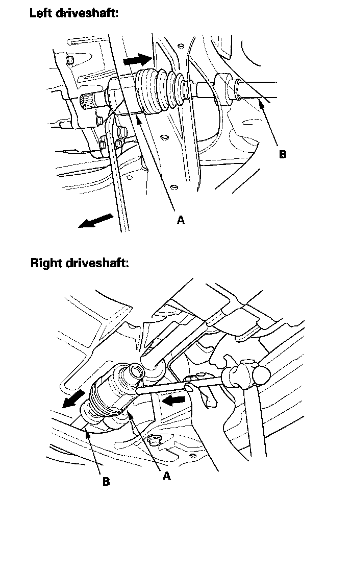 9. Left driveshaft: Pry the inboard joint (A) from the differential case with a prybar. Right driveshaft: Drive the inboard joint off of the intermediate shaft with a drift and hammer. Remove the driveshaft as an assembly. Do not pull on the driveshaft (B), because the inboard joint may come apart. Draw the driveshaft straight out to avoid damaging the oil seal.