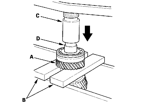 3. Support 6th gear (A) on steel blocks (B), then use a press (C) and an attachment (D) to press the countershaft out of the ball bearing.