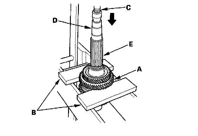5. Support 4th gear (A) on steel blocks (B), then use a press (C) and an attachment (D) to press the countershaft (E) out of the 5th gear.