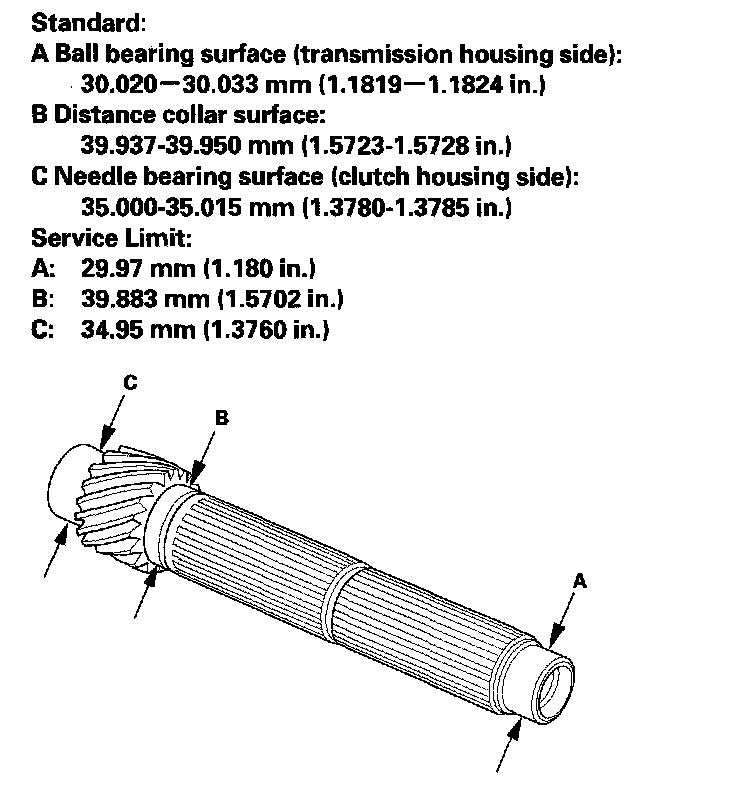 Countershaft Inspection1. inspect the gear and bearing surfaces for wear and damage, then measure the countershaft at points A, B, and C. If any part of the countershaft is less than the service limit, replace it.