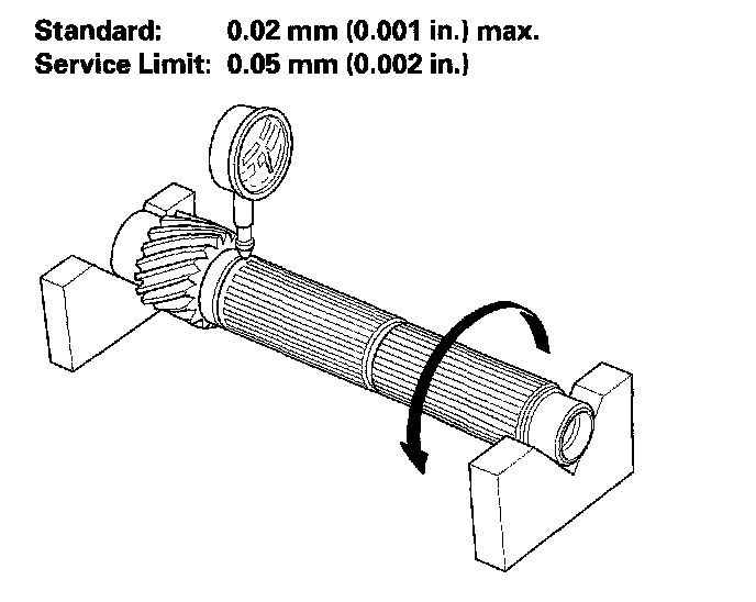 2. Inspect the runout by supporting both ends of the countershaft. Then rotate the countershaft two complete turns while measuring with a dial gauge. If the runout exceeds the service limit, replace the countershaft.