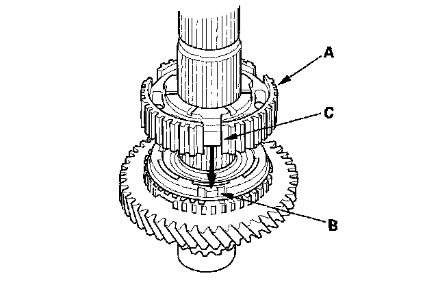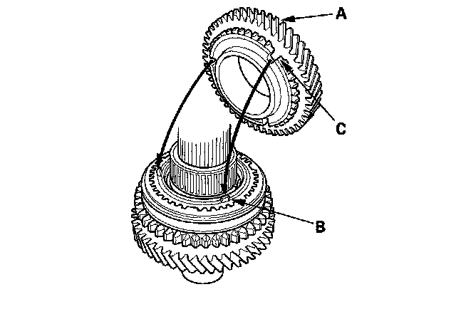 10. Install 2nd gear (A) by aligning the synchro cone fingers (B) with the grooves (C) in 2nd gear.