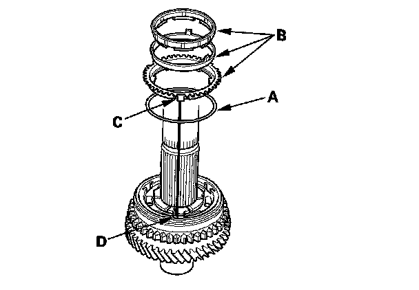 3. Install the triple cone synchro assembly (A) by aligning the synchro cone fingers (B) with the grooves in 1st gear (C), then install the synchro spring (D).