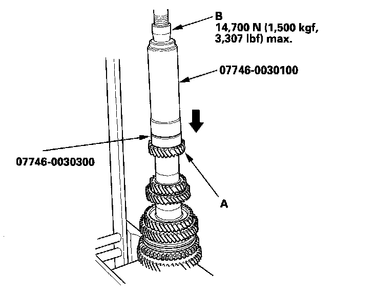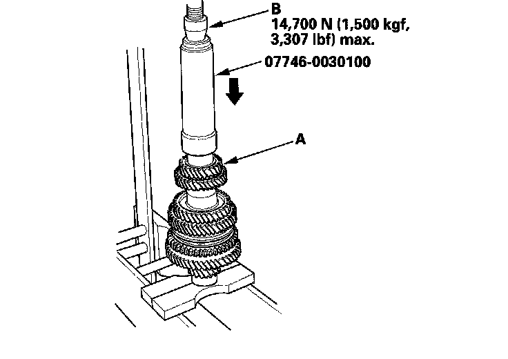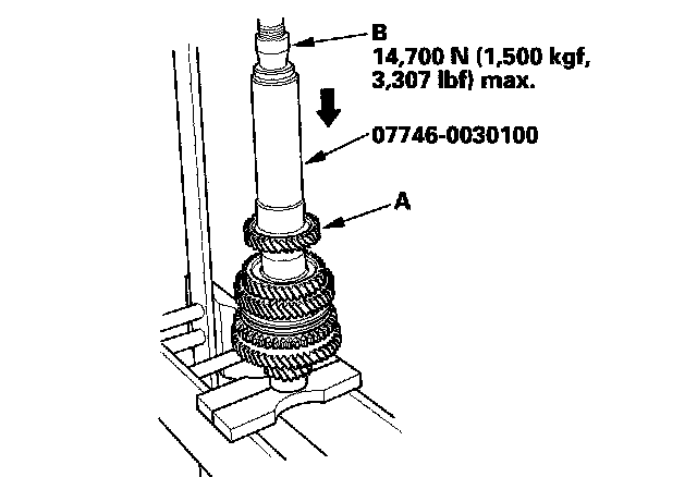 12. Install 4th gear (A) using the special tool and a press (B). Do not exceed the maximum pressure.
