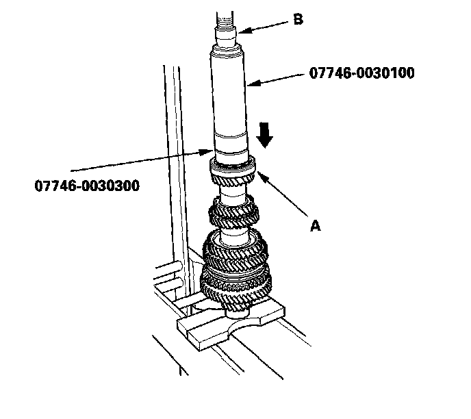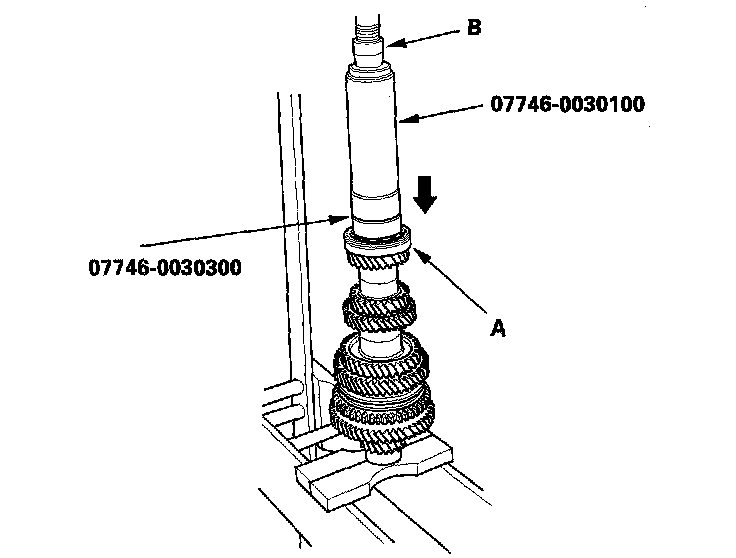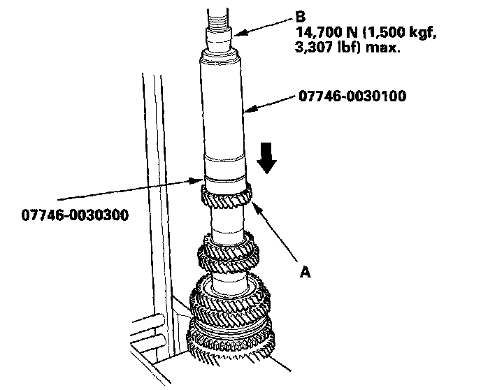13. Install 5th gear (A) using the special tool and a press (B). Do not exceed the maximum pressure.