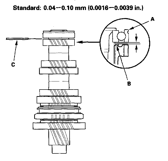 16. Measure the clearance between the old bearing (A) and the 35 mm shim (B) with a feeler gauge (C).