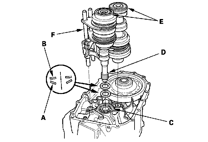 3. Apply tape to the mainshaft splines (D) to protect the seal. Install the mainshaft and the countershaft (E) into the shift forks (F), and install them as an assembly.