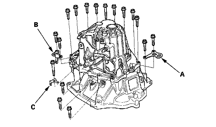 13. Install the transmission hanger A, the transmission hanger B, the harness bracket (C), and the 8 mm flange bolts, finger-tight.