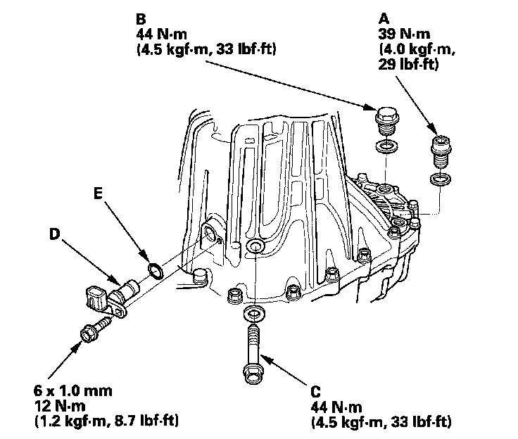 18. Install the drain plug (A), the filler plug (B), the 10 mm flange bolt (C), the output shaft (countershaft) speed sensor (D), and the new O-ring (E).