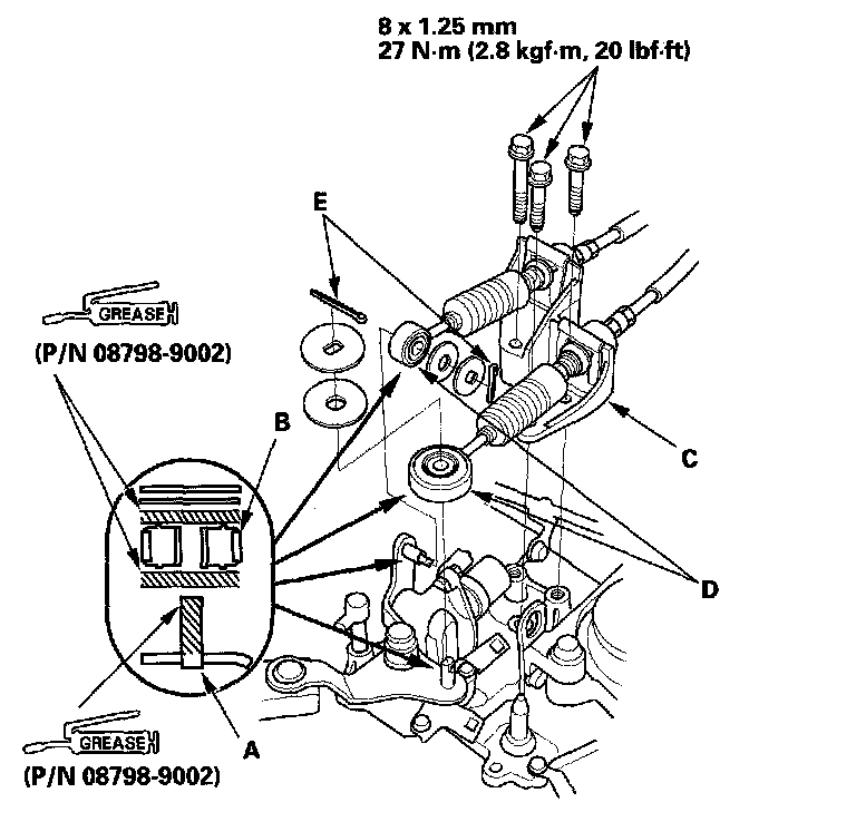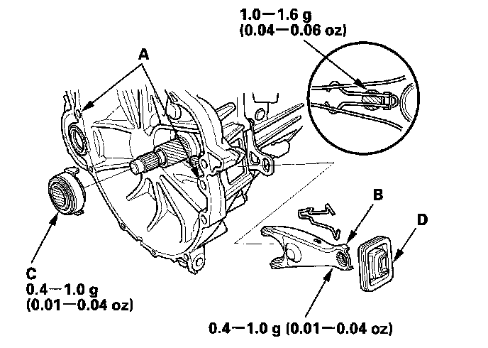 3. Apply super high temp urea grease (P/N 08798-9002) to the release fork (B) and the release bearing (C). Install the release fork, the release bearing, and the boot (D).