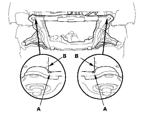 11. Align the front subframe reference marks (A) to the body (B), as noted during removal. Tighten the subframe mounting bolts to the specified torque.